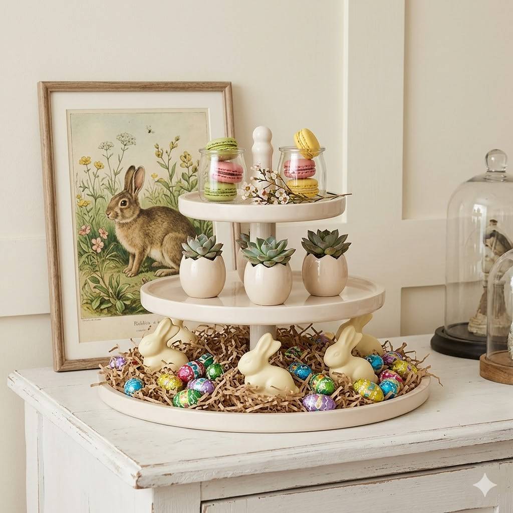 The Details: On the bottom tier, arrange a bed of shredded Kraft paper grass and top with white chocolate bunnies or foil-wrapped eggs. On the top tier, place a few potted succulents in tiny egg-shaped planter.