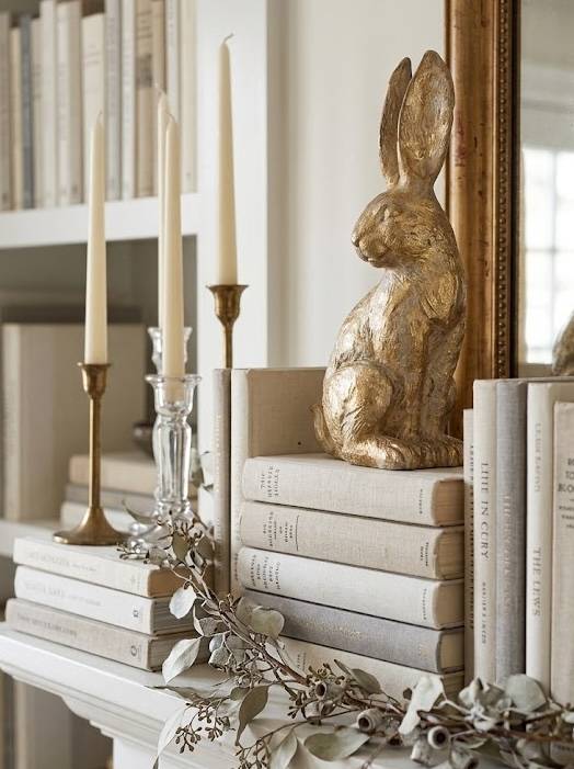 The Details: Perch a single golf-leaf or brass bunny figurine atop the highest stack. Drape a garland of dried eucalyptus or forsythia across the front.
