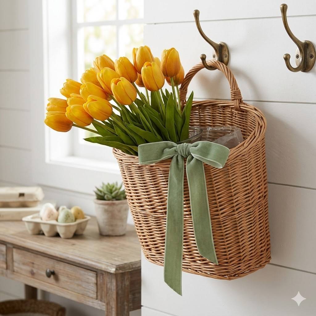 The Finishing Touch: Tie a long, trailing velvet ribbon in a soft sage green or dusty rose around the handle. It's a simple, high-impact alternative to a traditional wreath.